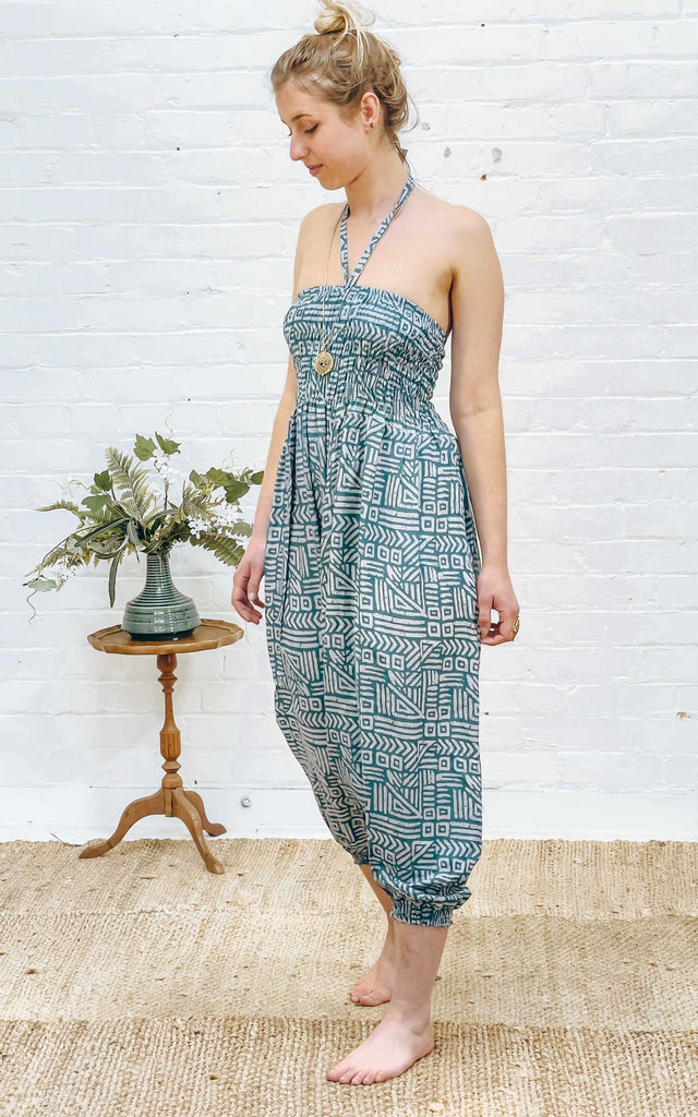 Classic Aladdin pant, drop-crotch shape with a shirred wasit band that allows use as a jumpsuit or pants. 100% Rayon, the Two Way Aladdin Pant provides ultimate comfort without sacrificing style
